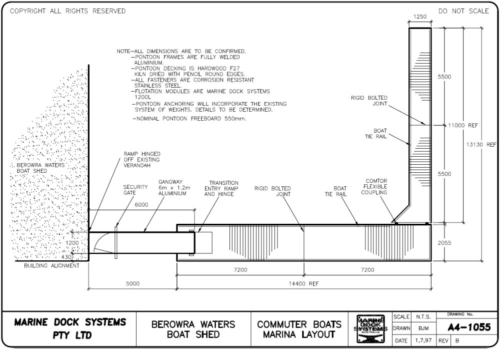 These are pictures of pontoons at Berowra Waters Sydney Australia. All with Marine Dock Systems floats under them. Some recent, some built in 1980 and still going strong. There is a mix of timber framed pontoons decked with hardwood. Aluminium framed pontoons deck with hardwood timber. Aluminium frames with concrete decking. A lot of these photos also have our aluminium ramps / gangways on them. Some of these pontoons were built by someone else on our Marine Dock Systems floatation modules. Please veiw the photo's to see just what is possible with our universal pontoon system.